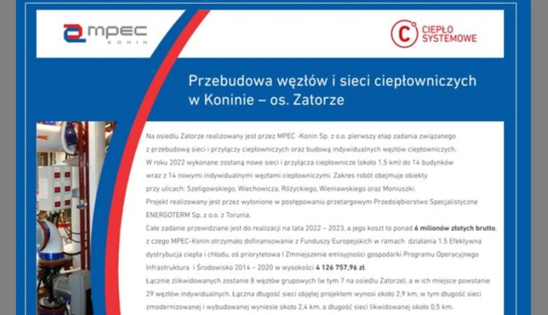 Wspólnie ze Spółdzielnią Mieszkaniową „Zatorze” opracowaliśmy projekt ulotki, dotyczącej realizowanej na osiedlu inwestycji. Oprócz opisu projektu zostały na niej wymienione korzyści wynikające z likwidacji węzłów grupowych i zastąpienia ich węzłami indywidualnymi. Ulotki zostały dostarczone mieszkańcom lokalizacji objętych projektem.