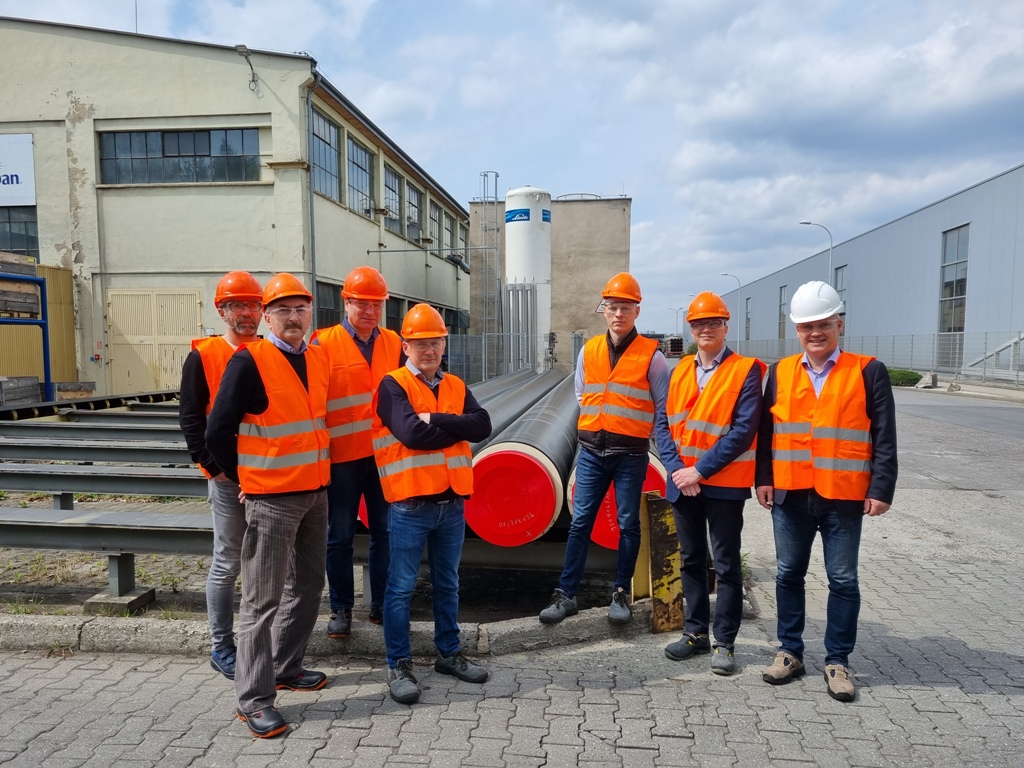 W dniu 21.04.2022 r. delegacja kadry technicznej MPEC-Konin zwiedzała fabryki Kingspan/Logstor International Sp. z o.o., mieszczące się w trzech miejscowościach: Zabrze, Gliwice oraz Żory. Firma Logstor specjalizuje się w produkcji rur, muf oraz kształtek preizolowanych stosowanych między innymi w ciepłownictwie. Rury te składają się z rury właściwej (głównie stalowej), pianki poliuretanowej (izolacja termiczna) oraz rury osłonowej z polietylenu PE. Pracownicy MPEC- Konin rozpoczęli zwiedzanie od fabryki w Zabrzu, gdzie mogli na żywo zobaczyć produkcję kształtek i rur preizolowanych metodą tradycyjną, dozowanie pianki poliuretanowej, wytwarzanie rury osłonowej PE z granulatu oraz samo spawanie kształtek stalowych. Wszystkie wytwarzane produkty przechodzą przez stanowiska kontroli jakości, co eliminuje usterki i daje najwyższą jakość końcowego produktu. Następnie delegacja udała się do fabryki w Gliwicach, która specjalizuje się głównie w produkcji muf służących do łączenia rur oraz kształtek preizolowanych. Mufy te są wytwarzane (podobnie jak rura osłonowa) z granulatu. Nasza delegacja na wstępie zapoznała się z ofertą działu wsparcia technicznego Logstor, po czym udała się na część produkcyjną. Ostatnim zwiedzonym miejscem, była fabryka w Żorach, w której można było zobaczyć produkcję rur preizolowanych metodą tradycyjną oraz metodą innowacyjną. Polega ona na owinięciu pianki poliuretanowej taśmą z polietylenu (na gorąco), która tworzy rurę osłonową. W tej metodzie można zastosować barierę antydyfuzyjną (folię aluminiową), która chroni przed dyfuzją gazów występujących w piance poliuretanowej. Na zdjęciu delegacja MPEC-Konin wraz z dyrektorem handlowym firmy Logstor.