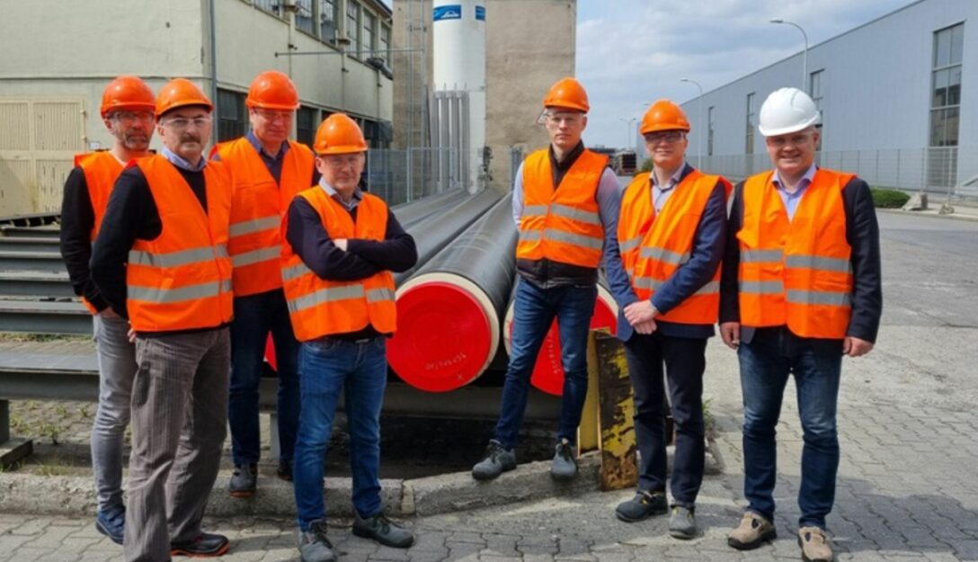W dniu 21.04.2022 r. delegacja kadry technicznej MPEC-Konin zwiedzała fabryki Kingspan/Logstor International Sp. z o.o., mieszczące się w trzech miejscowościach: Zabrze, Gliwice oraz Żory. Firma Logstor specjalizuje się w produkcji rur, muf oraz kształtek preizolowanych stosowanych między innymi w ciepłownictwie. Rury te składają się z rury właściwej (głównie stalowej), pianki poliuretanowej (izolacja termiczna) oraz rury osłonowej z polietylenu PE. Pracownicy MPEC- Konin rozpoczęli zwiedzanie od fabryki w Zabrzu, gdzie mogli na żywo zobaczyć produkcję kształtek i rur preizolowanych metodą tradycyjną, dozowanie pianki poliuretanowej, wytwarzanie rury osłonowej PE z granulatu oraz samo spawanie kształtek stalowych. Wszystkie wytwarzane produkty przechodzą przez stanowiska kontroli jakości, co eliminuje usterki i daje najwyższą jakość końcowego produktu. Następnie delegacja udała się do fabryki w Gliwicach, która specjalizuje się głównie w produkcji muf służących do łączenia rur oraz kształtek preizolowanych. Mufy te są wytwarzane (podobnie jak rura osłonowa) z granulatu. Nasza delegacja na wstępie zapoznała się z ofertą działu wsparcia technicznego Logstor, po czym udała się na część produkcyjną. Ostatnim zwiedzonym miejscem, była fabryka w Żorach, w której można było zobaczyć produkcję rur preizolowanych metodą tradycyjną oraz metodą innowacyjną. Polega ona na owinięciu pianki poliuretanowej taśmą z polietylenu (na gorąco), która tworzy rurę osłonową. W tej metodzie można zastosować barierę antydyfuzyjną (folię aluminiową), która chroni przed dyfuzją gazów występujących w piance poliuretanowej. Na zdjęciu delegacja MPEC-Konin wraz z dyrektorem handlowym firmy Logstor.