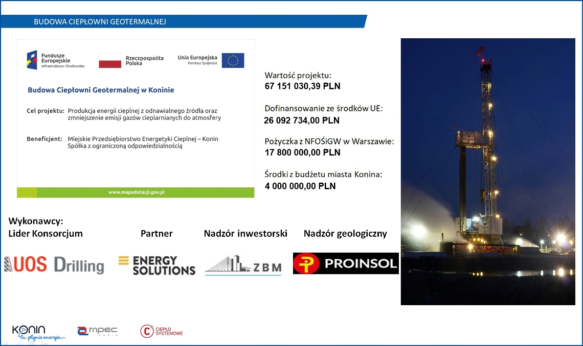 Powoli dobiega końca budowa ciepłowni geotermalnej na konińskiej wyspie Pociejewo. W maju zakończono prace wiertnicze, zgodnie z zatwierdzonym w 2018 roku projektem robót geologicznych. Projekt robót geologicznych zatwierdza się na czas oznaczony, nie dłuższy niż 5 lat. Ze względu na konieczność przygotowania i zatwierdzenia nowego projektu robót geologicznych, kolejne prace zostały wznowione w sierpniu. Będą one polegały na oczyszczeniu otworu Konin GT-3 oraz wykonaniu testu dubletu geotermalnego Konin GT-1 i Konin GT-3. W tym samym czasie nieprzerwanie trwają prace wykończeniowe w budynku ciepłowni. Technologia dubletu geotermalnego polega na wydobywaniu wody z jednego otworu, tzw. eksploatacyjnego, pionowego Konin GT-1, dostarczaniu jej do wymienników ciepła, w których ciepło jest pośrednio przekazywane do wody w sieci ciepłowniczej, po czym schłodzona woda wprowadzana jest do otworu tzw. zatłaczającego, kierunkowego Konin GT-3. Wszystko funkcjonuje w obiegu zamkniętym, woda zostaje wydobywana z głębokości 2660 m i z powrotem tam wpompowana. Otwory Konin GT-1 i GT-3 na powierzchni oddalone są od siebie zaledwie o 23 metry, a ich dna o blisko kilometr. Zakończenie budowy ciepłowni geotermalnej planowane jest na czwarty kwartał tego roku.