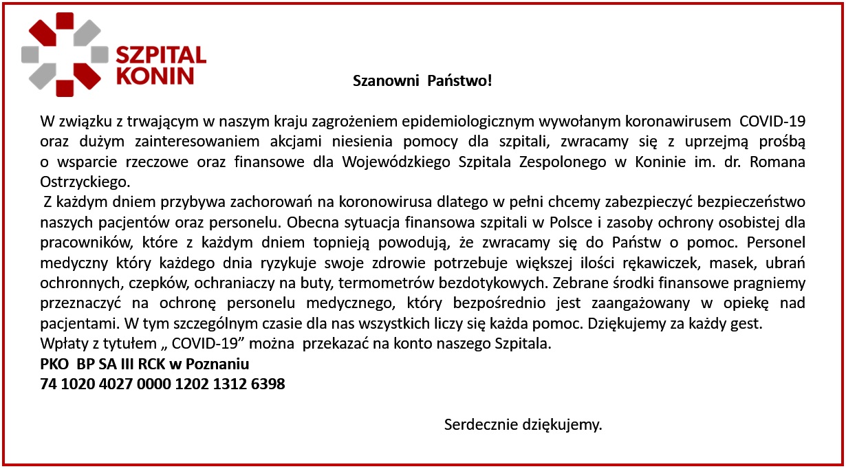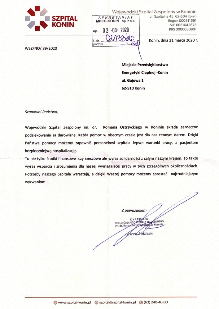 Miejskie Przedsiębiorstwo Energetyki Cieplnej – Konin Sp. z o.o i Pracownicy odpowiedzieli na prośbę o wsparcie finansowe dla Wojewódzkiego Szpitala Zespolonego im. dr. Romana Ostrzyckiego w Koninie. W ten sposób chcemy podziękować pracownikom szpitala za ich ciężką pracę w czasie pandemii koronawirusa. Jesteśmy z Wami i dziękujemy.