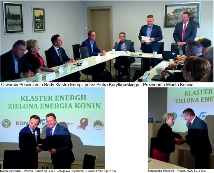 22 listopada 2019 roku odbyło się posiedzenie Rady Klastra Energii „Zielona Energia Konin” podczas, którego jednogłośnie przyjęto dwóch nowych uczestników, tj. Miejski Zakład Komunikacji Sp. z o.o. oraz Przedsiębiorstwo Gospodarki Komunalnej i Mieszkaniowej Sp. z o.o. w Koninie. Klaster został powołany w połowie 2018 roku z inicjatywy Przedsiębiorstwa Wodociągów i Kanalizacji Sp. z o.o. i ma za zadanie integrować potencjały oraz podmioty związane z rynkiem energetycznym, a w szczególności rynkiem Odnawialnych Źródeł Energii. Dzięki aktywnemu uczestnictwu spółek miejskich oraz miasta Konina możliwe będzie bilansowanie zarządzania energią poprzez stworzenie sieci współpracy na rzecz zmian w obszarze gospodarki niskoemisyjnej. Klaster to tworzenie warunków do rozwoju zeroemisyjnych technologii i wykorzystania naturalnych zielonych zasobów centralnej lokalizacji miasta. Już dziś PWiK Sp. z o.o. ma największą w mieście instalację fotowoltaiczną o mocy 100 kW, co pozwala na obniżanie kosztów działalności przedsiębiorstwa, zwiększa bezpieczeństwo energetyczne i pozytywnie wpływa na środowisko. Podmioty wchodzące w skład Klastra mogą być zarówno producentem energii, jaki odbiorcą, co w przyszłości zwiększy bezpieczeństwo energetyczne spółek. Główne cele jakie postawili sobie uczestnicy Klastra to między innymi: budowa ciepłowni geotermalnej, kolejnych instalacji fotowoltaicznych na terenie PWiK, MZGOK, PGKiM i MPEC, regionalnej instalacji zagospodarowania osadów ściekowych i produkcja biogazu, modernizacja Stacji Uzdatniania Wody wraz z budową pompy ciepła i hybrydowego systemu magazynowania energii, przebudowa systemu ciepłowniczego miasta Konina, uruchomienie zamkniętego systemu fermentacji i kompostowania odpadów biodegradowalnych, budowa linii średniego napięcia łączących uczestników Klastra. Realizacja tych inwestycji ma prowadzić do samowystarczalności energetycznej i zaspokojenia potrzeb na energię wszystkich podmiotów w obrębie Klastra. Zgodnie z Uchwałą nr 1/2021 Rady Klastra Energii od dnia 10.11.2021 r. koordynatorem KE ZEK jest Miejski Zakład Gospodarki Odpadami Komunalnymi Sp. z o.o. w Koninie.