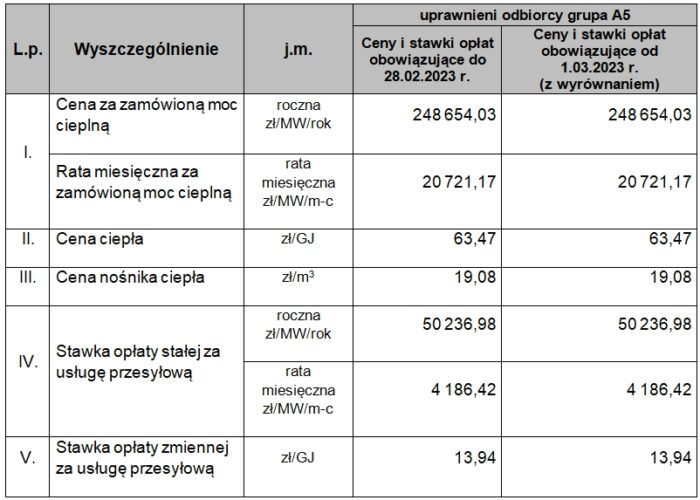 W związku z wejściem w życie ustawy z dnia 8 lutego 2023 r. o zmianie ustawy o szczególnych rozwiązaniach w zakresie niektórych źródeł ciepła w związku z sytuacją na rynku paliw oraz niektórych innych ustaw (Dz. U. 2023 poz. 295) oraz opublikowaniem przez Prezesa URE maksymalnych cen dostaw ciepła (informacja nr 9/2023 z dn. 22.02.2023 r.) MPEC-Konin Sp. z o.o. wprowadza do stosowania od 1 marca 2023 r. dla uprawnionych odbiorców z grupy A5 wymienionych w art. 4 ust. 1 ww. ustawy, następujące ceny i stawki opłat za ciepło (stawki nie ulegają zmianie):