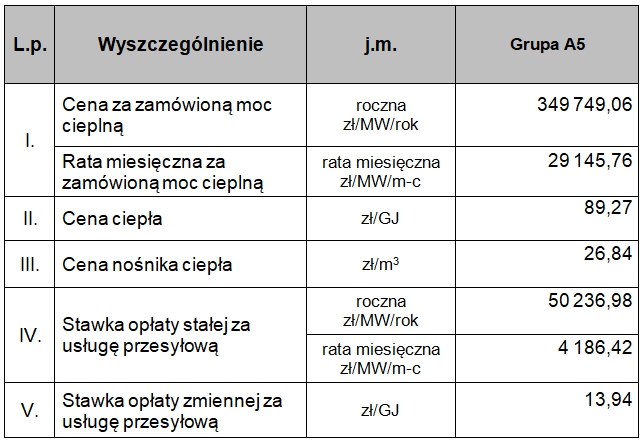 Ceny i stawki opłat dla pozostałych odbiorców z grupy A5 nie wymienionych w art. 4 ust. 1 ustawy pozostają bez zmian (tabela poniżej).