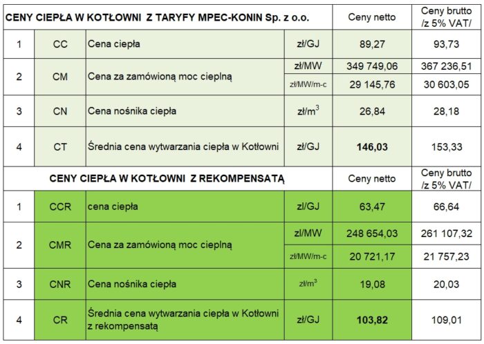 Informuję, że w okresie od 1 października 2022 roku do 30 kwietnia 2023 r. obowiązywać będzie dla uprawnionych odbiorców ciepła z grupy taryfowej A5 „średnia cena wytwarzania z rekompensatą” w kotłowni nr 1 zlokalizowanej na osiedlu Cukrownia Gosławice w Koninie. Podstawą zmian są zapisy ustawy o szczególnych rozwiązaniach w zakresie źródeł ciepła w związku z sytuacją na rynku paliw (Dz. U. 2022, poz. 1967). Zastosowany cennik dotyczy uprawnionych odbiorców wymienionych w art. 4 ust. 1 ustawy, którzy wypełnili obowiązki wynikające z jej treści.