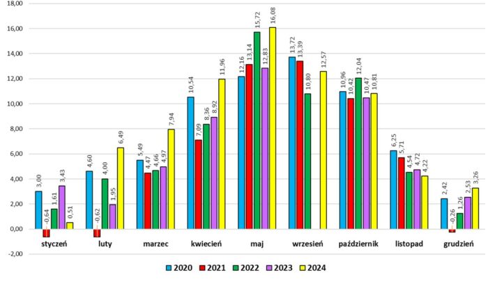 Porównanie rzeczywistych średniomiesięcznych temperatur zewnętrznych w poszczególnych miesiącach grzewczych w latach 2020- 2024.